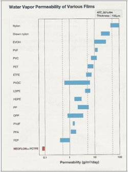 Compared to current plastics, the barrier properties of fluoropolymers (Figure 1) are exceptional. Aging, even at high temperatures and in the presence of solvents, oils, oxidizing agents, ultraviolet light and other environmental agents, is minimal because fluoropolymers do not use any leachable or degradable stabilizing additives. Fluoropolymers also have a low refractive index and visual appearance that is unchanged after exposure to light. Applications include drug containers and delivery systems components including bottles, vials, syringes and specimen trays.